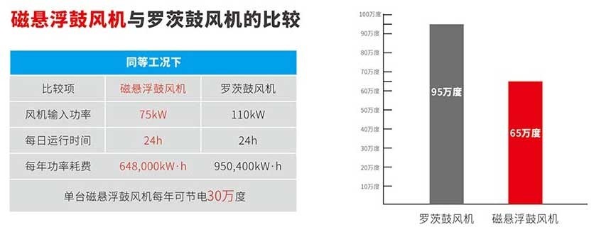 ◇ 以100kW磁悬浮鼓风机为例。与罗茨风机相比,每台磁悬浮风机可节省30万千瓦时以上的电能和20万元以上的电费。